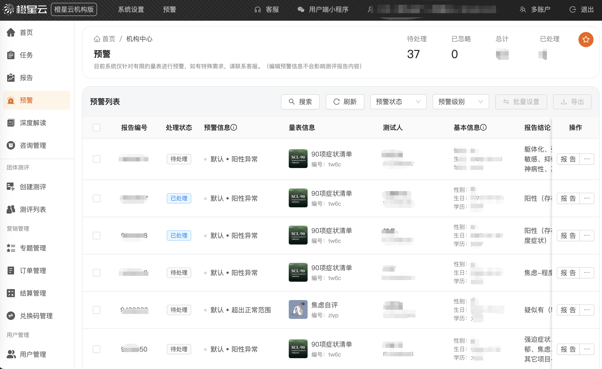 系统内置测评报告预警机制,可根据测评结果自动识别潜在的心理风险,并通过清晰的预警标识提醒相关负责人。 可根据任务筛选,避免工作冗余高效干预。 上一页 文章 橙星云机构版心理测评系统-团体测评 下一页 文章 橙星云机构版心理测评系统saas-报告预警 你可能还喜欢... 什么是“阳光抑郁”?它的症状表现是什么?2024-10-29 表演型人格,真的只是爱出风头吗?2024-10-29 swot分析法在心理测评中的应用与价值2024-10-29 易性症是什么?它与性别认同有何不同?2024-10-29 留下评论您的邮箱地址不会被公开。 必填项已用 * 标注 名称 * 邮箱 * 添加评论 * I accept the Privacy Policy 发表评论