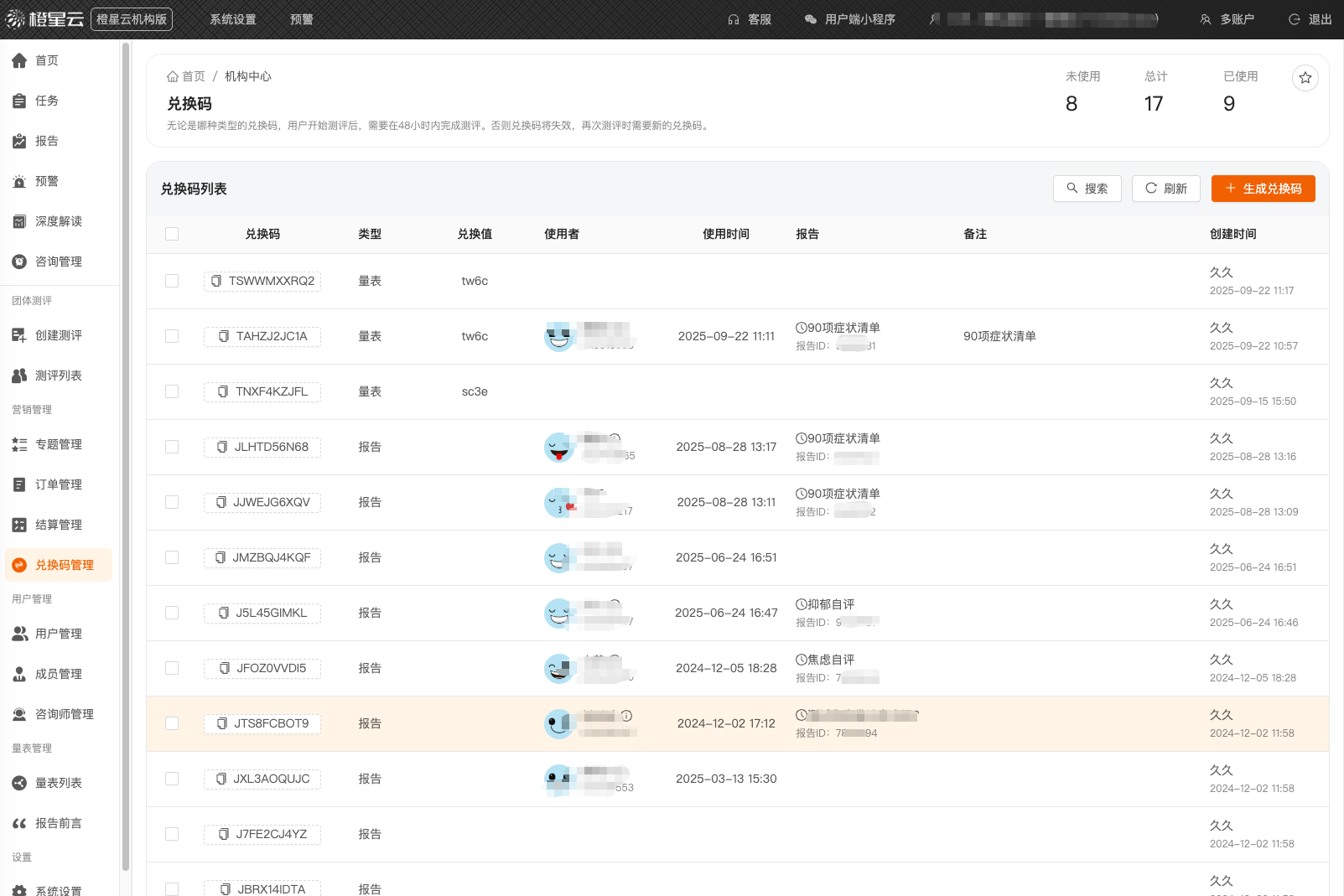 兑换码吸引潜在用户,解锁更多场景 系统内置了便捷的兑换码功能,企业可以通过发放兑换码并搭配适当的使用引导,吸引更多潜在用户参与测评。兑换码不仅可以作为营销活动的有效工具,还能帮助企业精准触达目标群体,同时为心理健康服务拓展更多可能性。 上一页 文章 别再猜来猜去!学会给人际关系 “看病”,让身边的关系都暖暖的 下一页 文章 橙星云机构版心理测评系统saas-任务 你可能还喜欢... 橙星云机构版心理测评系统saas-咨询管理2025-11-27 橙星云机构版心理测评系统saas-任务2025-11-27 橙星云机构版心理测评系统-专题管理2025-11-13 橙星云机构版心理测评系统-用户管理2025-10-30 留下评论您的邮箱地址不会被公开。 必填项已用 * 标注 名称 * 邮箱 * 添加评论 * I accept the Privacy Policy 发表评论